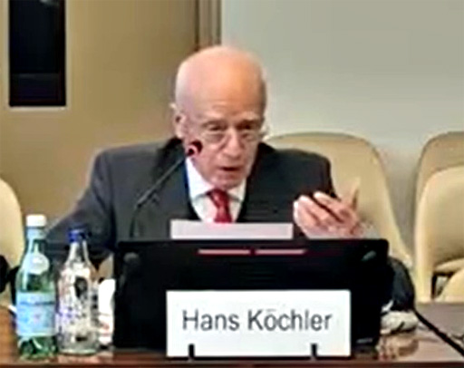 hans köchler - selected video clips United Nations, Palais des Nations, Geneva, 1 April 2026 World Forum on the Future of Democracy, Hotel Adlon, Berlin, 16 February 2026 United Nations, Palais des Nations, Geneva, 1 October 2025 The Phoenicia Roundtable, Malta, 25 September 2025 Debate -- The Nordic Initiative, Dalmahoy Castle, Edinburgh, Scotland, 1 September 2025 Cultural Diplomacy Forum, Ohrid, North Macedonia, 11 October 2024 The Bosphorus Roundtable, Istanbul, 12 September 2024 International Book Fair, Abu Dhabi, UAE, 30 April 2024 Skopje Cultural Diplomacy Forum, North Macedonia, 5 September 2023 Academy for Cultural Diplomacy, Berlin, 25 February 2023 Universite Paris 1 Panthéon-Sorbonne, Paris, France, 9 February 2023 University of Szcezin, Poland, November 2022 Deutscher Bundestag / German Parliament, Berlin, 10 November 2022 International Progress Organization, Vienna, 30 October 2022 University of Humanities and Social Sciences, Saint Petersburg, 1 September 2022 Amphithéâtre Charif Idrissi, Université Mohammed V, Rabat, 1 June 2022 RT International, Moscow - London- Washington - New York, 3 April 2022 United Nations Association of the USA, Long Beach, California, USA, 31 October 2021 Dante Alighieri Institute, Berlin, 28 May 2021 International Schiller Institute, virtual event, 8 May 2021 International Schiller Institute, virtual event, 8 May 2021 (traduction simultanée en français) Université Paris 1 - Panthéon Sorbonne & Université Le Havre, 11 February 2021 United Nations, virtual event, 10 December 2020 Horasis Extraordinary Meeting (digital), 1 October 2020 Schiller Institute, Frankfurt a.M., Germany, 1 July 2018 The New American, USA, May 2018 Conference on the Origin of Life and the Universe, Istanbul, 28 April 2018 Conference on Cultural Diplomacy, ICD, Berlin, 17 December 2017 A9 TV, Istanbul, Interview, 24 August 2017 A9 TV, Istanbul, 24 August 2017 DOC TV, Berlin, 28 February 2017 Belarus 1 TV, Актуальное интервью ,18 January 2017 Новости Беларуси, TV 1, 4 December 2016 Пятый канал / Channel 5, ГЛАВНОЕ, Russia, 13 November 2016 Belarus TV 1, PANORAMA, 24 May 2016 ТВ Сонце / TV Sonce, Skopje, Macedonia, 21 March 2016 Conference on Cultural Diplomacy, Berlin, Germany, 13 December 2015 Panel discussion on terrorism and democracy, Berlin, Germany, 13 December 2015